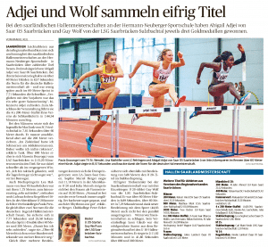Ein Beitrag von Manuel Keil in der SZ, Ausgabe Regionalverband, vom 18.01.2020 zu den Saarländischen Hallenmeisterschaften der Aktiven und U20 in der Leichtathletikhalle der Hermann-Neuberger-Sportschule.