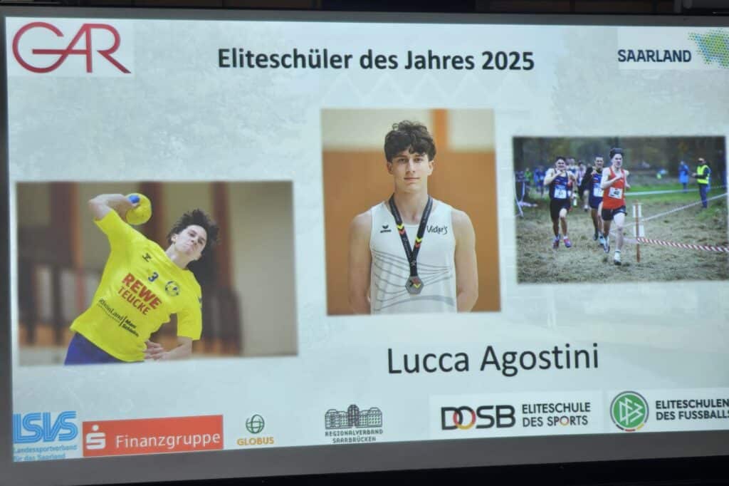 Bei der diesjährigen Ehrung zum Elitesportler des Jahres wurde unser Langsprinter Lucca Agostini ausgezeichnet. Anwesenheit waren neben den Repräsentanten des Gymnasiums Vertreter von LSVS, Sparkasse Saarbrücken, Bildungsministerium, Regionalverband, Olympiastützpunkt, ehemalige Preisträger sowie Elternvertreter.
