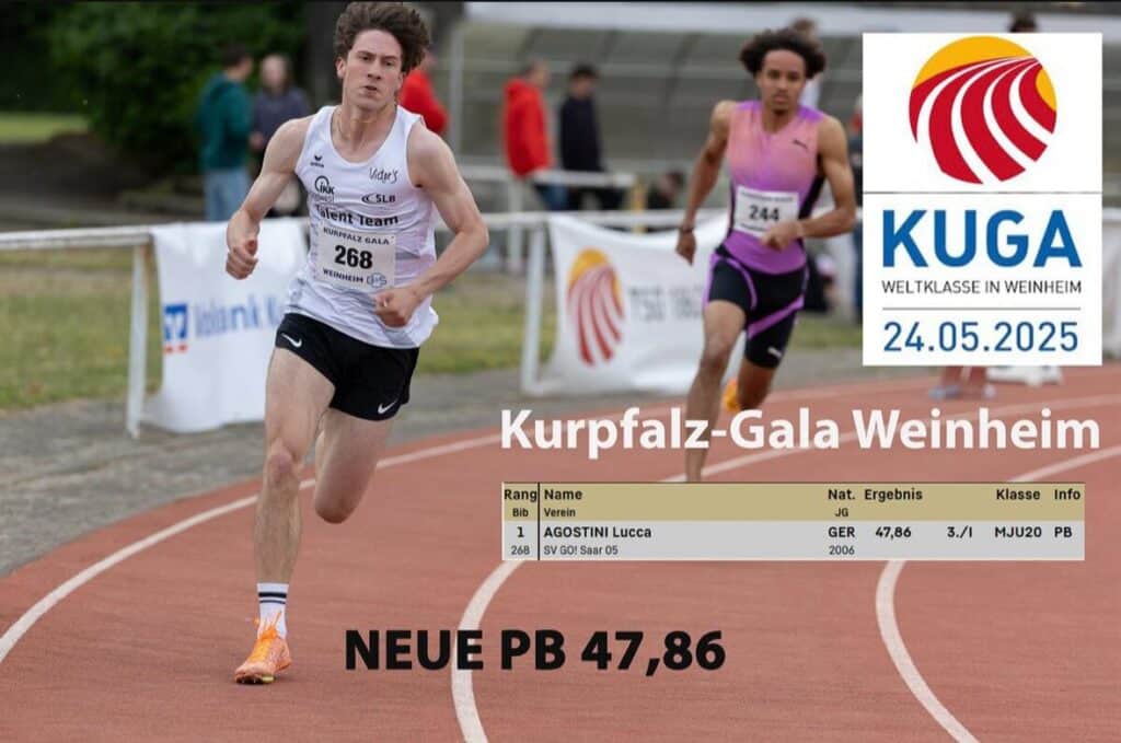 Bei der gleichen Veranstaltung in Weinheim ging auch Lucca Agostini, U20 Athlet Jahrgang 2006, der Silbermedaillen-gewinner über 400 m bei den deutschen Jugend-Hallenmeisterschaften, an den Start. Lucca – sowohl über 400 m als auch 800 m in der deutschen Spitze, will sich für die U20 Europameisterschaften qualifizieren. Die Norm hierfür liegt bei 47,35 sec, ein echtes „Brett“. Lucca ging einen Ticken zu schnell an (22,1 sec/200 m) und lief mit 47,86 sec knappe drei Zehntel an der Norm vorbei, setzte sich jedoch mit dieser neuen pB als schnellster U20 Sprinter in Weinheim durch. Er belegt jetzt Platz 2 der deutschen Bestenliste der U20.