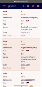 In der aktuellen Europäischen U18-Bestenliste liegt Maja ebenfalls auf Position zwei.