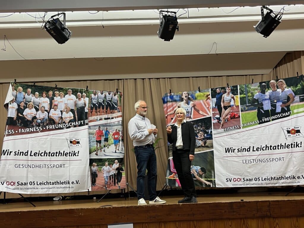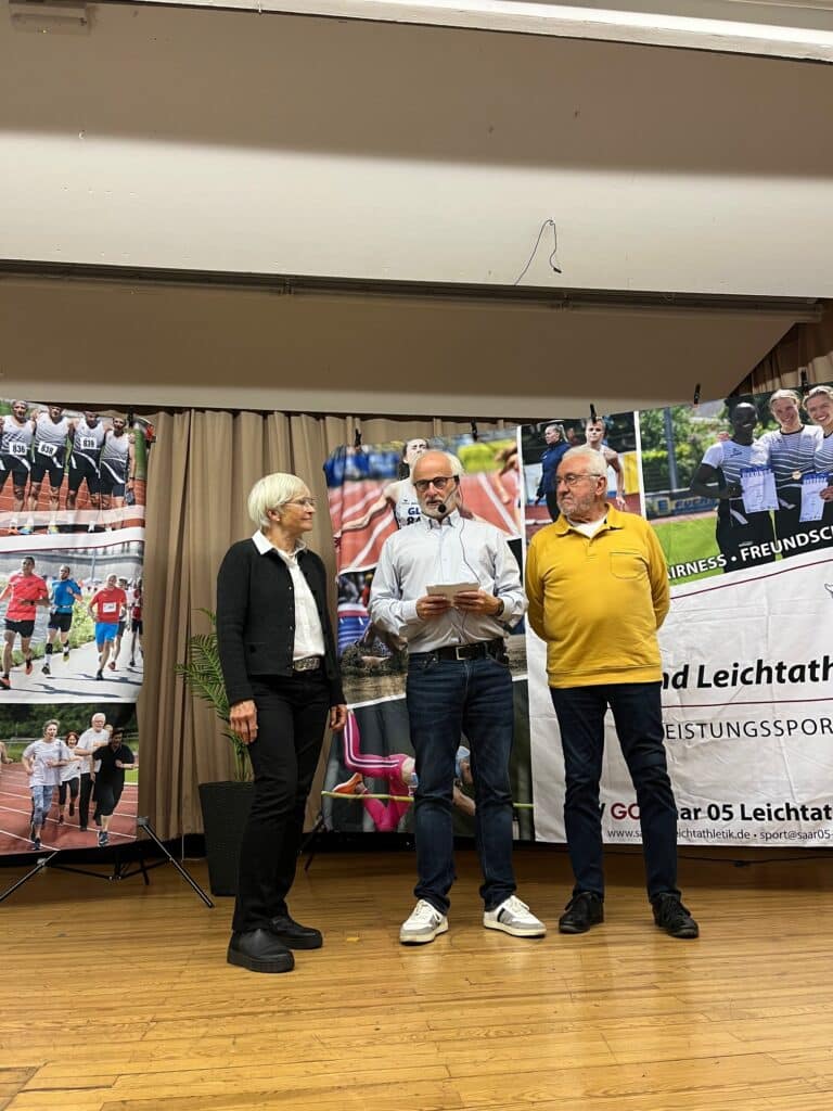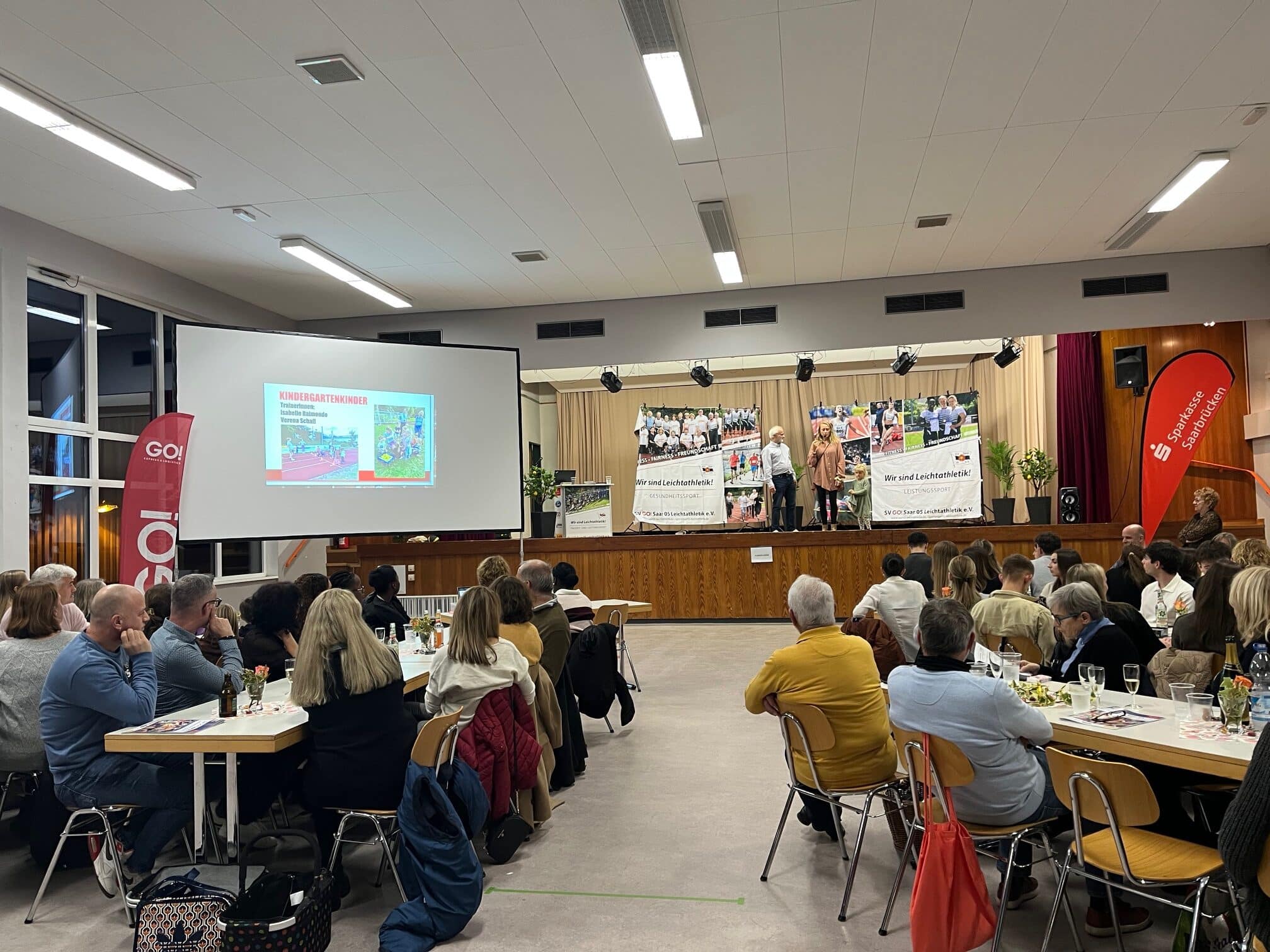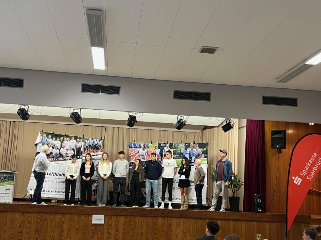 Der SV GO! Saar 05 Leichtathletik e.V. kann auf eine in jeglicher Hinsicht erfolgreiche Saison zurückblicken. Grund genug, die sportlichen Erfolge und die wachsenden Teilnehmerzahlen bei unseren Veranstaltungen zu feiern. Hierzu trafen sich am 15. November ca. 80 AthletInnen, TrainerInnen, FreizeitsportlerInnen und Ehrenamtler in der Festhalle Schafbrücke: Einige waren mit Partnerin oder Partner, manche gleich mit der ganzen Familie gekommen, um gemeinsam das überwiegend in Eigenregie produzierte Buffet zu genießen, sich kennenzulernen und auszutauschen, viel über den Verein und seine Aktivitäten und Angebote zu erfahren und viel Spaß zu erleben. Viele beteiligten sich an sportlichen Indoor-Wettkämpfen, wo es um Geschicklichkeitsübungen in Fünfergruppen ging, die teilweise erheblichen Ehrgeiz zeigten. Herausragend hierbei 301 Hula-Hoop-Umdrehungen einer jungen Sportlerin, die letztlich aus Zeitgründen zum Abbrechen aufgefordert werden musste, aber auch viele andere erstaunliche Ergebnisse! Diese Spiele und auch ein Quiz mit Fragen rund um den Verein und die Leichtathletik hatte sich Bärbel Breder-Thonet einfallen lassen und diese Programmpunkte auch moderiert.